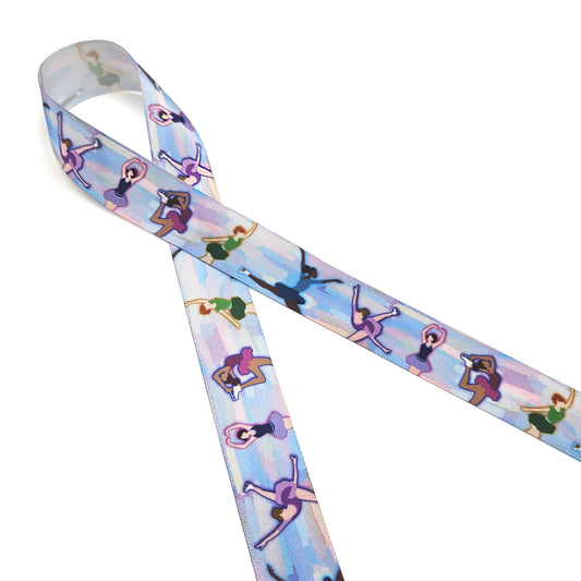 Figure Skater ribbon Skaters in watercolor pastels printed on 7/8" and 1.5" White single face satin satin