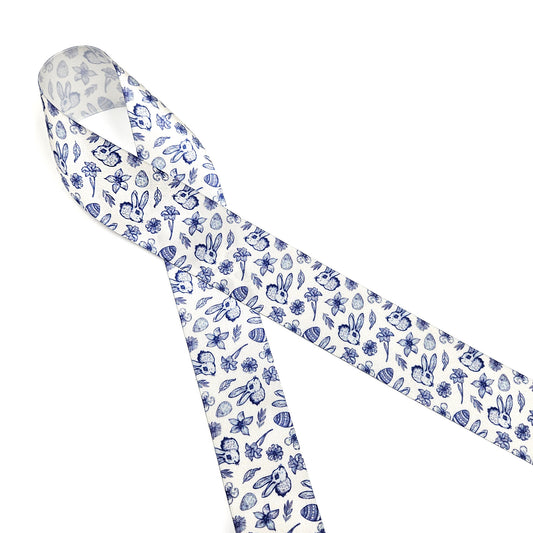 Easter Toile ribbon with bunnies, flowers, eggs and leaves in three colors raspberry, green and blue printed on 1.5" satin