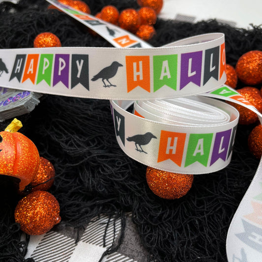 Happy Halloween ribbon with party banners of orange, lime, purple and black printed on 7/8" white single face satin