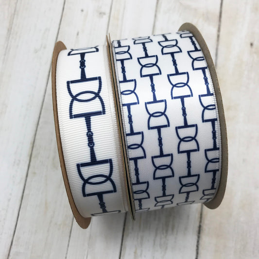 Snaffle bit ribbon with navy blue bits printed on 7/8" white single grosgrain