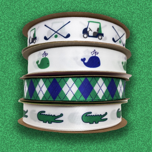 Alligator ribbon green alligators with navy blue outline printed on 5/8" white satin