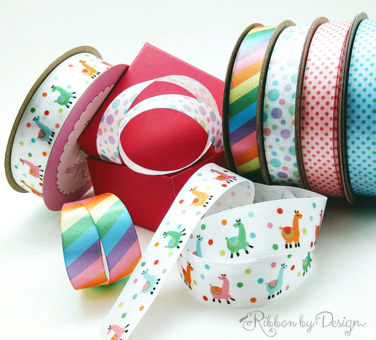 Llamas ribbon in pastel colors printed on 7/8" white single face satin