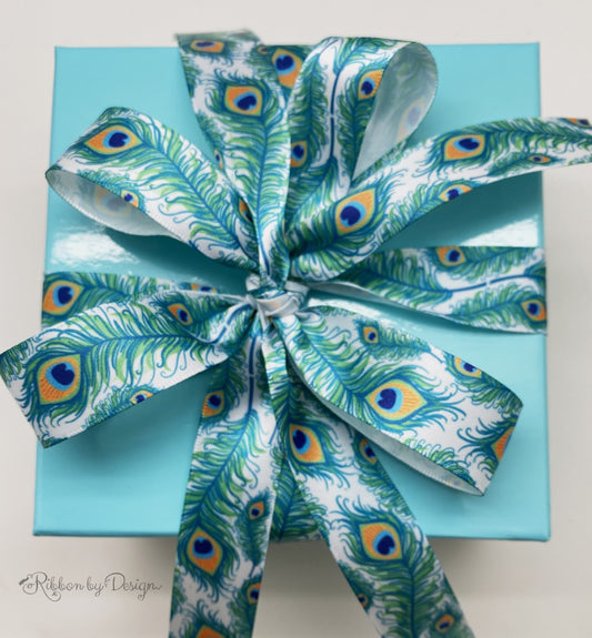 Peacock feathers ribbon in turquoise, green and yellow on 7/8" white single face satin