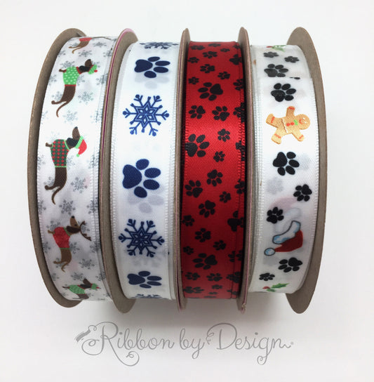 Dachshund ribbon, Dachshunds dressed in Holiday sweaters printed on 5/8" white single face satin