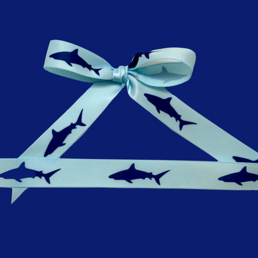 Sharks ribbon in navy blue printed on 5/8" light blue single face satin
