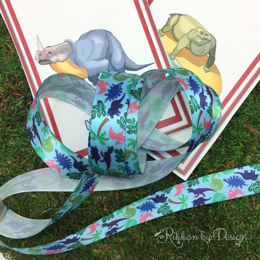 Dinosaur Ribbon printed on 5/8" Lt. Blue single face satin