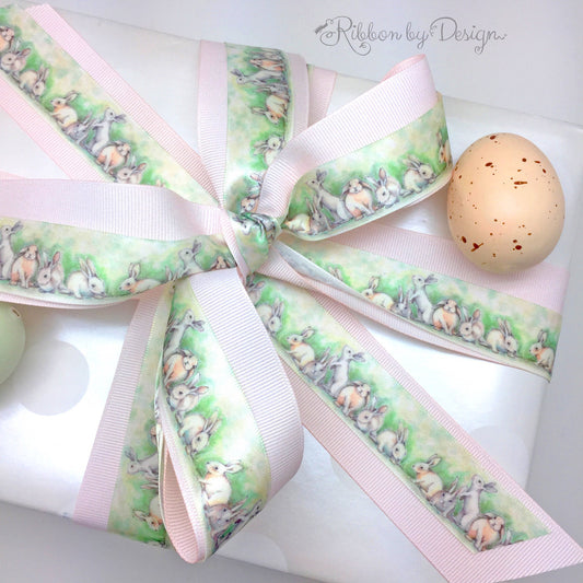 Bunny Ribbon, Watercolor rabbit design on 7/8" White Single Face Satin