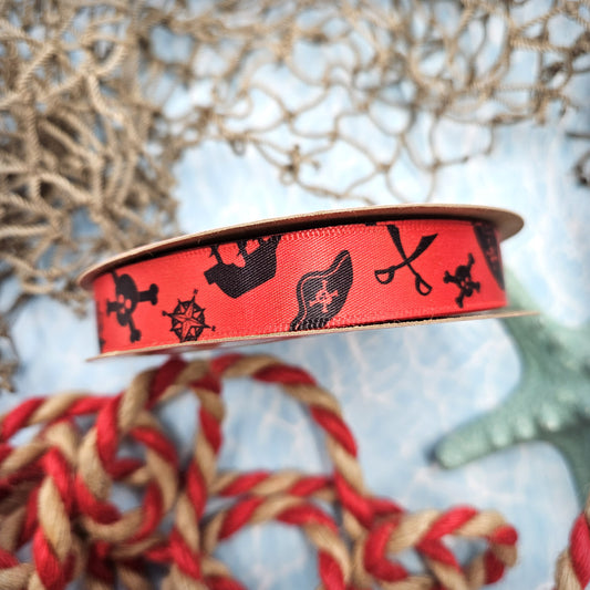 Pirate Ribbon silhouettes in black on 5/8" red single face satin ribbon