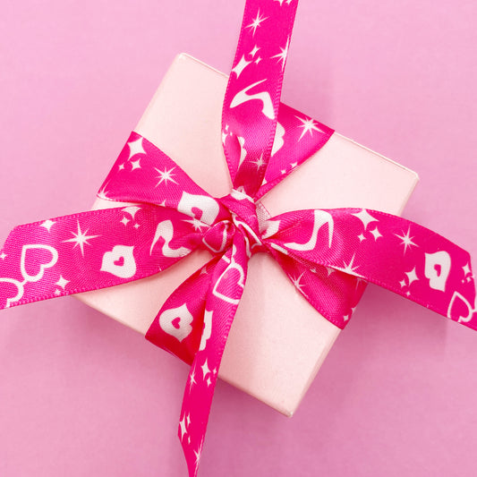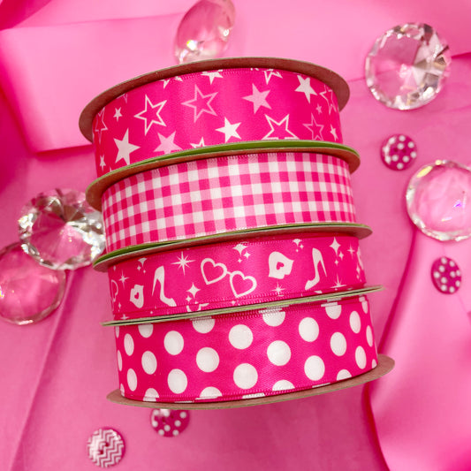 Hot pink ribbon Barbie inspired features shoes, hearts, lips and stars in white on a hot pink background printed on 5/8"white satin