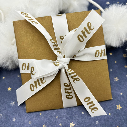 First birthday ribbon One in gold printed on 5/8" white single face satin