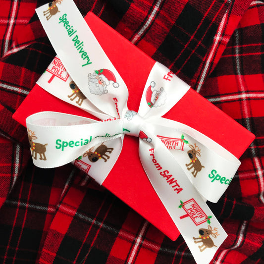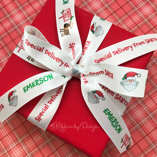 Special Delivery from Santa Ribbon printed on 7/8" white satin