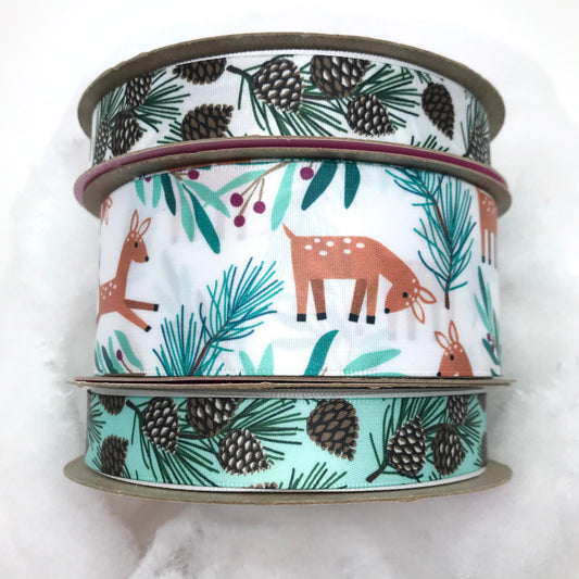 Woodland Fox ribbon with red flowers and fern on a dark green background printed on 7/8" and 1.5" white single face satin ribbon