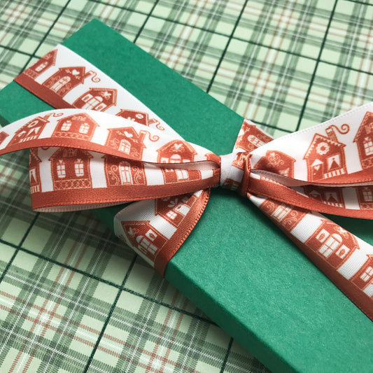 Ginger bread houses in a row printed on 7/8" white single face satin