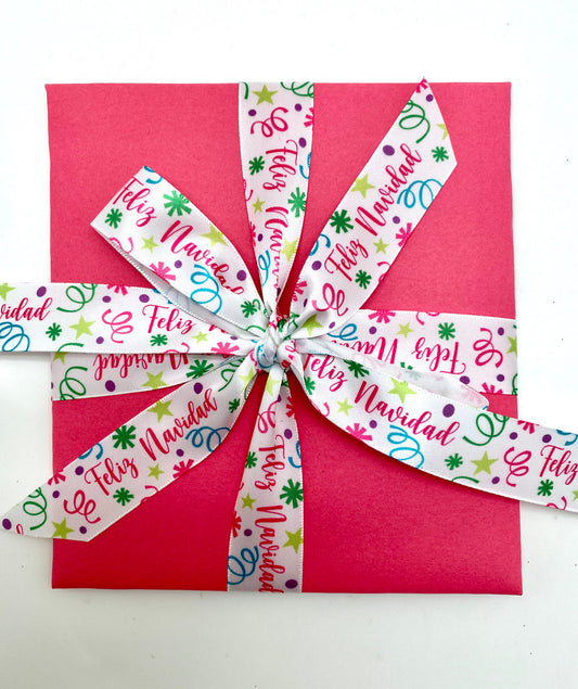 Feliz Navidad Ribbon with confetti and streamers in pink, green, blue and purple printed on 7/8" white single face satin 10 yrds