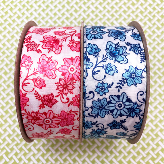 Chinoiserie Ginger jar floral design ribbon red and white printed on 1.5" white single face satin