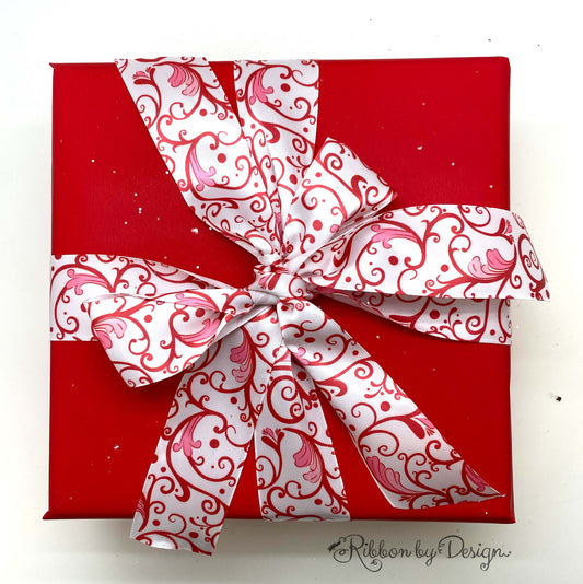 Personalized Monogram holiday ribbon in red with a red Chinoiserie design printed on 1.5" white single face satin, 90 yards
