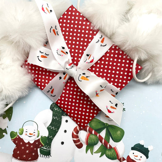 Snowman ribbon snowman faces printed on 7/8" white satin