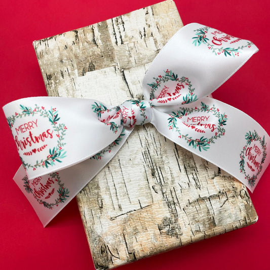 Christmas Ribbon Merry Christmas printed on 1.5" white satin