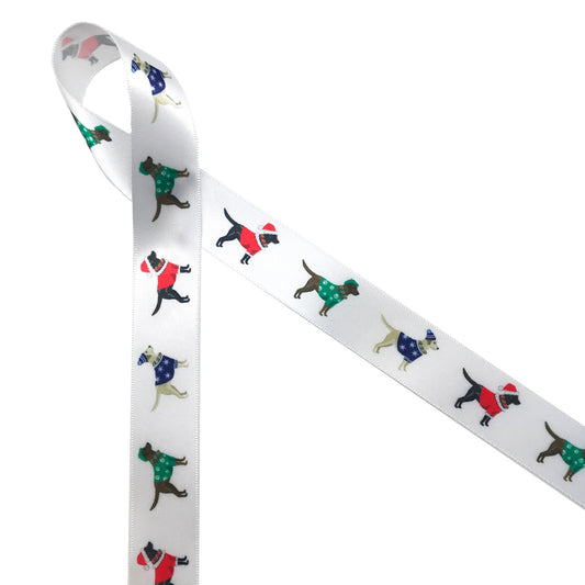 Labrador Retriever in holiday sweaters ribbon printed on 7/8" white satin and grosgrain