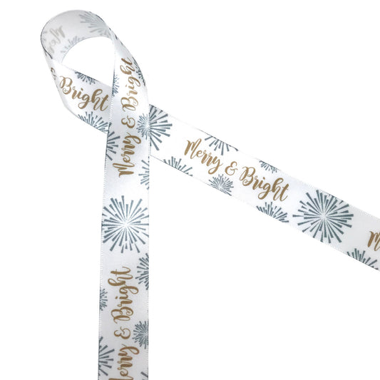 Merry and Bright Holiday ribbon in silver and gold or pink and green with vintage sun bursts printed on 7/8" white single face satin ribbon