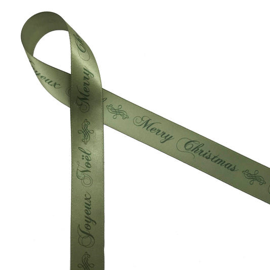 Joyeux Noel, Merry Christmas Ribbon in green on 7/8" Willow green Single Face Satin ribbon