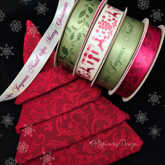 Joyeux Noel, Merry Christmas Ribbon in ruby red on 7/8" Antique White Single Face Satin ribbon