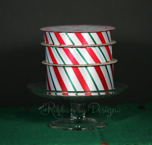 Christmas Ribbon Candy Cane Stripes Red and Green on 5/8" White Single Face Satin ribbon