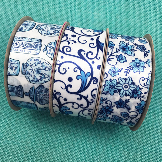 Ginger Jar ribbon in blue and white Chinoiserie style designs printed on 7/8" and 1.5" white single face satin ribbon