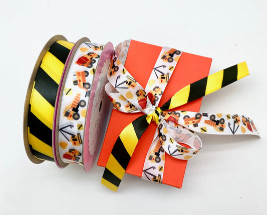 Caution Tape Ribbon with black stripes on 5/8" daffodil yellow single face satin