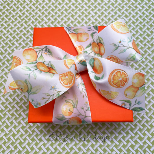 Oranges ribbon oranges with leaves printed on 1.5" white satin