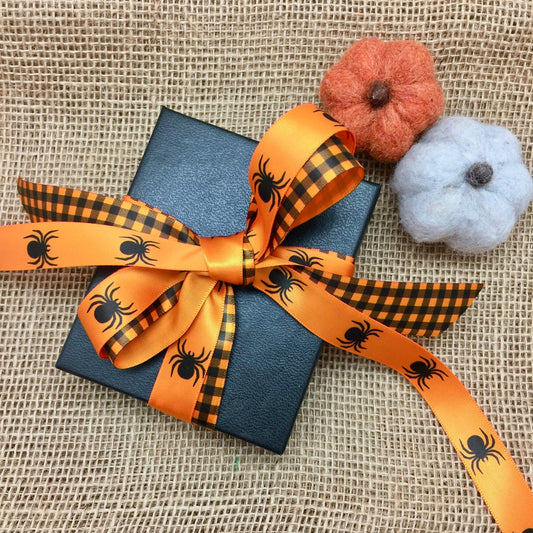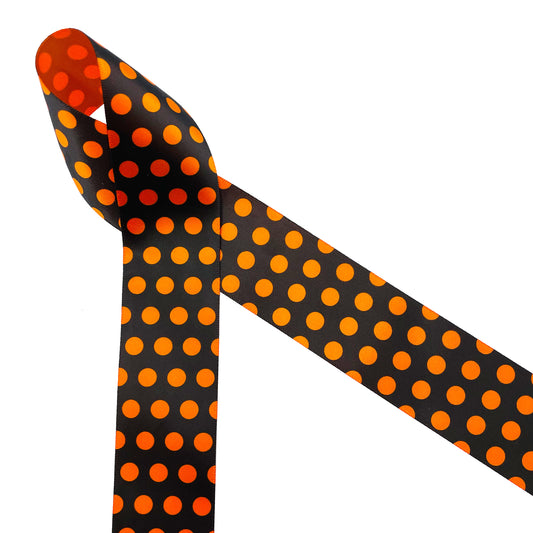 Orange Polka Dot ribbon on orange on black for Halloween treats printed on 5/8", 7/8" and 1.5" orange satin