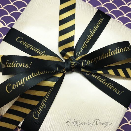Black and gold stripe ribbon printed on 5/8" dijon gold