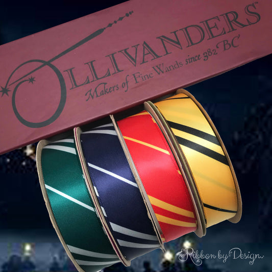 Wizard ribbon stripes of silver and green printed on 1.5" silver satin