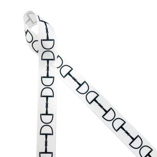 Snaffle bit ribbon with black or navy bits printed on 7/8"white or pink single grosgrain