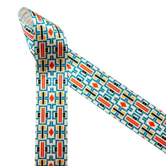 Aztec Design ribbon printed in three color ways of orange, black and cream printed on 1.5" white grosgrain