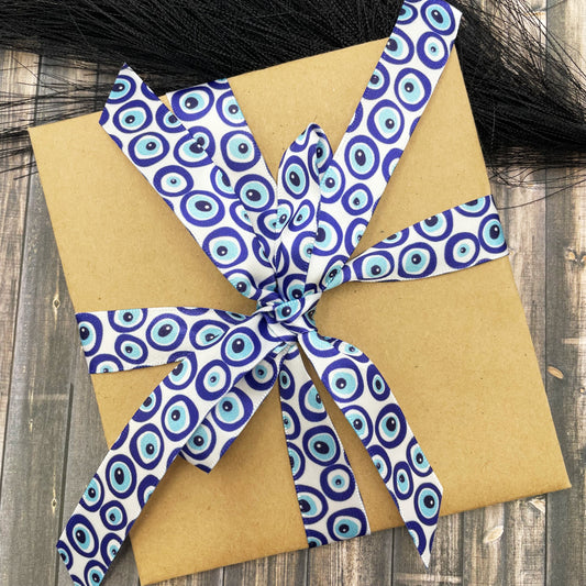 Evil eye ribbon in blue and white printed on 5/8" white single face satin