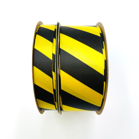 Caution Tape ribbon diagonal black stripes printed on 5/8" 7/8" and 1.5" bright yellow single face satin