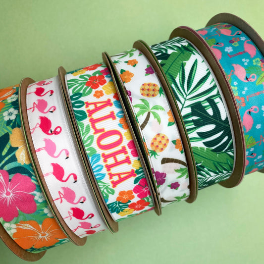 Hawaiian theme Aloha ribbon tropical flowers printed on 7/8" white grosgrain