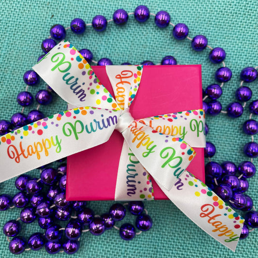 Happy Purim ribbon with confetti dots in primary colors printed on 7/8" white satin