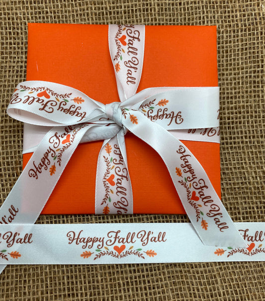 Happy Fall Ya'll ribbon in rust with Fall elements printed on 7/8" white single face satin ribbon