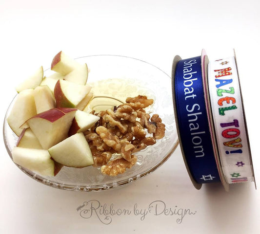 Shabbat Shalom Ribbon for Seder,Bar Mitzvah, Bat Mitzvah, Jewish gifts, Passover, on a blue background on 5/8" white satin