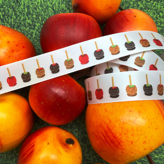 Candy apple ribbon with apples dipped in red, caramel and chocolate printed on 7/8" white satin