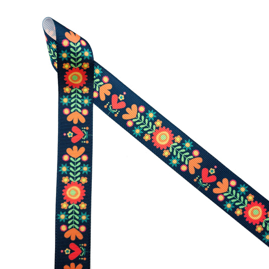 Boho Floral ribbon coral, orange, red and green flora on a navy background printed on 7/8" satin and grosgrain