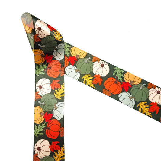 Fall Pumpkin Ribbon artful pumpkins in orange, green, yellow and white with Fall leaves on a dark green background printed on 7/8" and 1.5" white satin