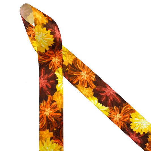 Fall Floral ribbon Mum blossoms for Fall decor and Thanksgiving printed on 7/8" and 1.5" white satin