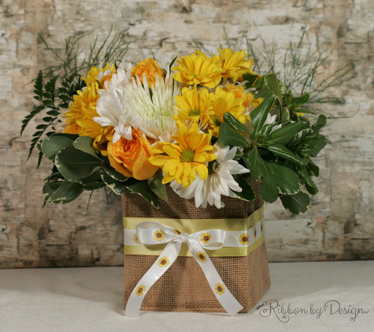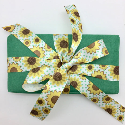 Sunflower ribbon with green dots printed on 7/8" and 1.5" white grosgrain