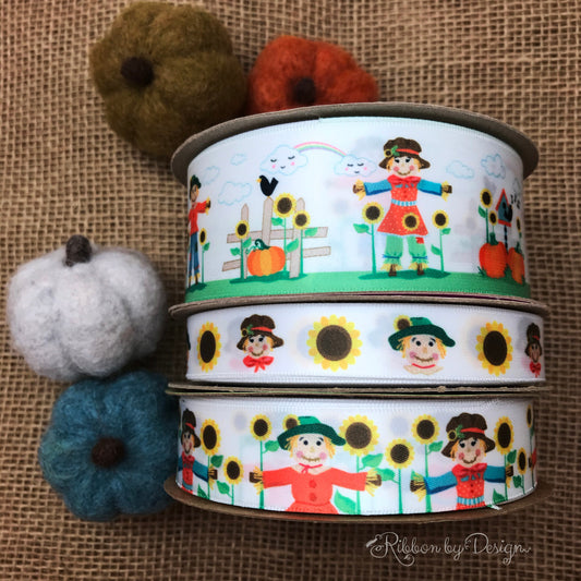 Scarecrow ribbon with sunflowers printed on 5/8" white single face satin ribbon