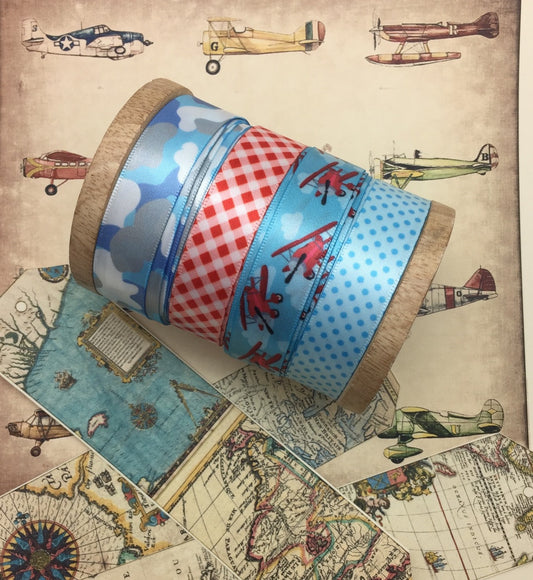 Airplane Ribbon red airplanes on a blue background with clouds on white 5/8" single face satin ribbon