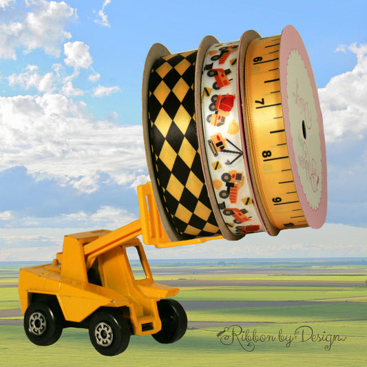 Construction vehicle Ribbon dump trucks, cement mixers and backhoes printed on 5/8" white single face satin