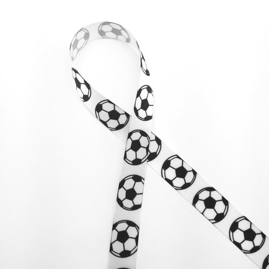 Soccer Ball Ribbon black and white soccer balls printed on 5/8" white single face satin or grosgrain